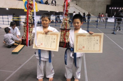 準優勝来晟は初戦から絶好調、圧力のある突き蹴りで勝利をモノにしていきます。決勝戦延長戦で相手にうまく戦われ吉村道場初の優勝を逃しましたが、持ち味の負けん気を前面に出す立派な戦いでした。グラチャンに続き準優勝は大したモノです。次は必ず優勝トロフィーを持ち帰りましょう。